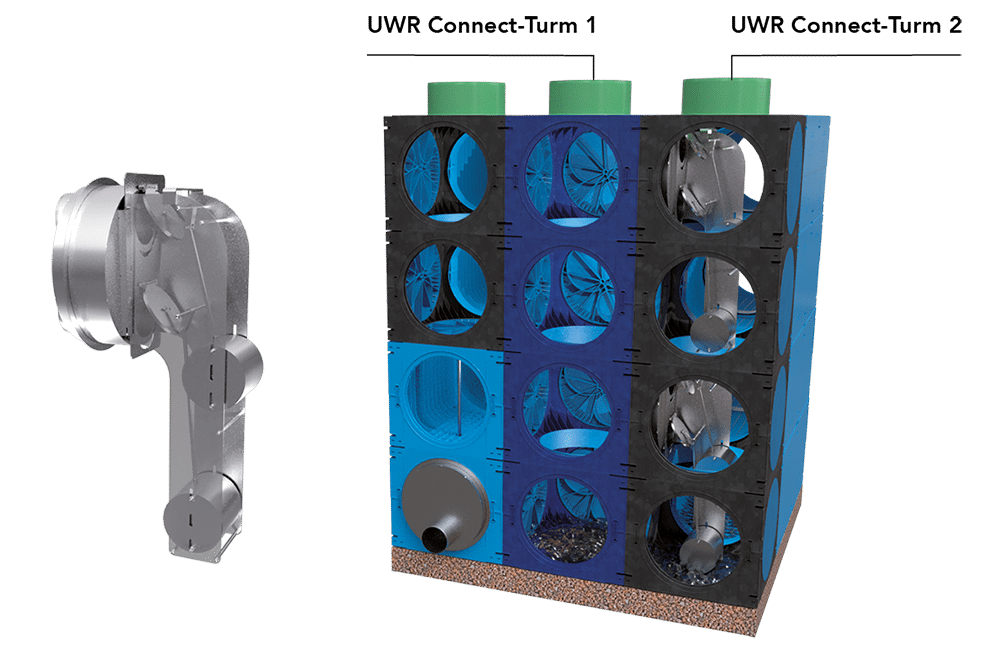 UWR Connect-Turm 2, in dem GWS montiert ist, ist über UWR Connectringe und UWR Pipe Module mit dem Rest des Beckensystems verbunden. Ziel der 2 Schließeinheiten in GWS ist es, den Wasserstand im Becken und die Grundwasserhöhe zu differenzieren, sodass Platz für Oberflächenwasser im Becken bleibt. Es wird immer einen differenzierten Abstand von 40 cm zwischen dem Grundwasser in Turm 1 und Turm 2 geben.